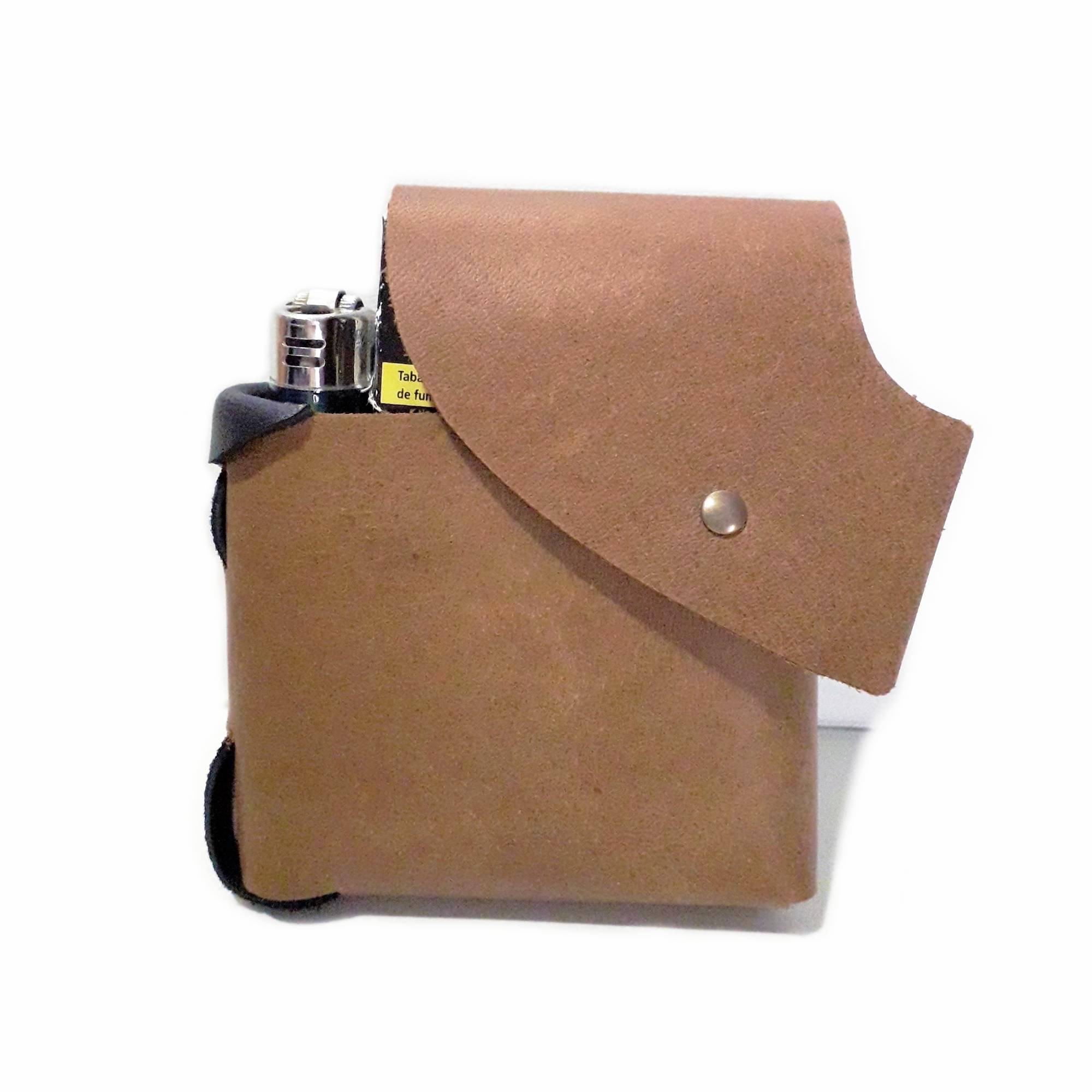 Etui en cuir pour paquet de cigarettes vendues par 20, avec porte briquet adapté à une taille standard.