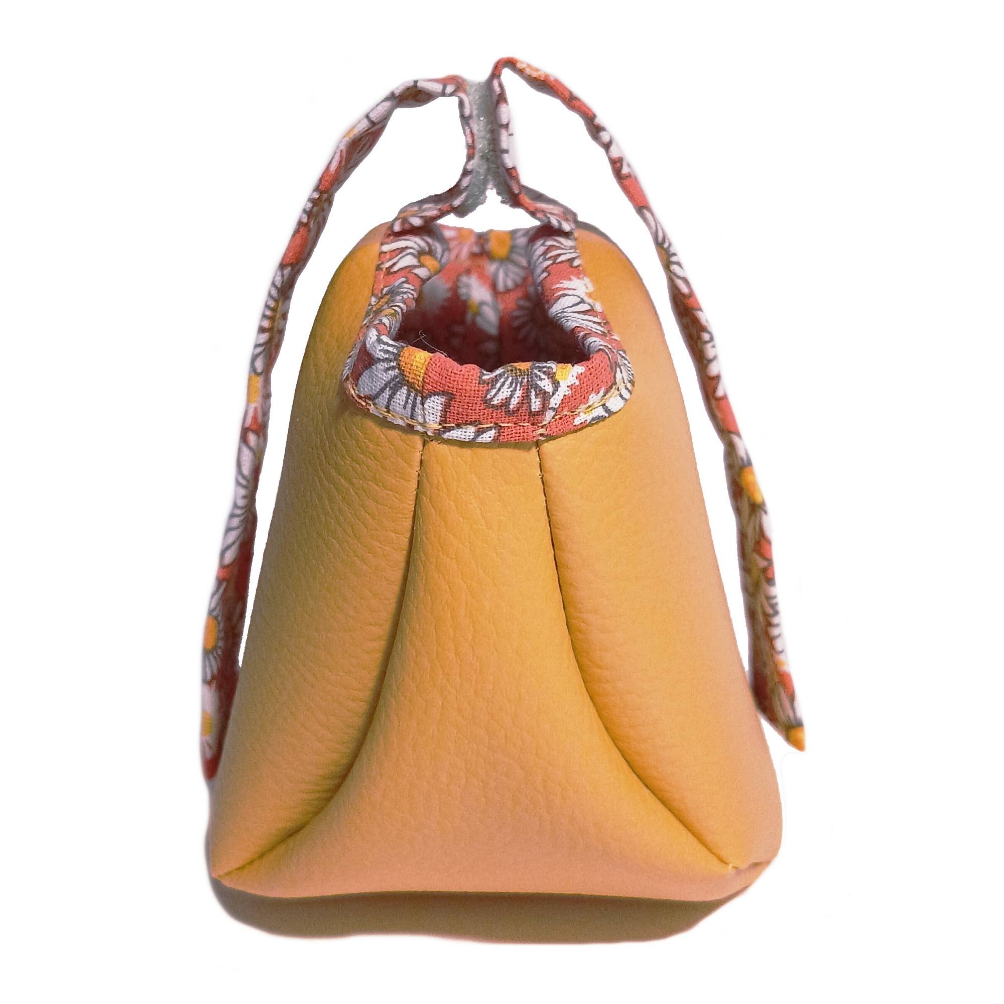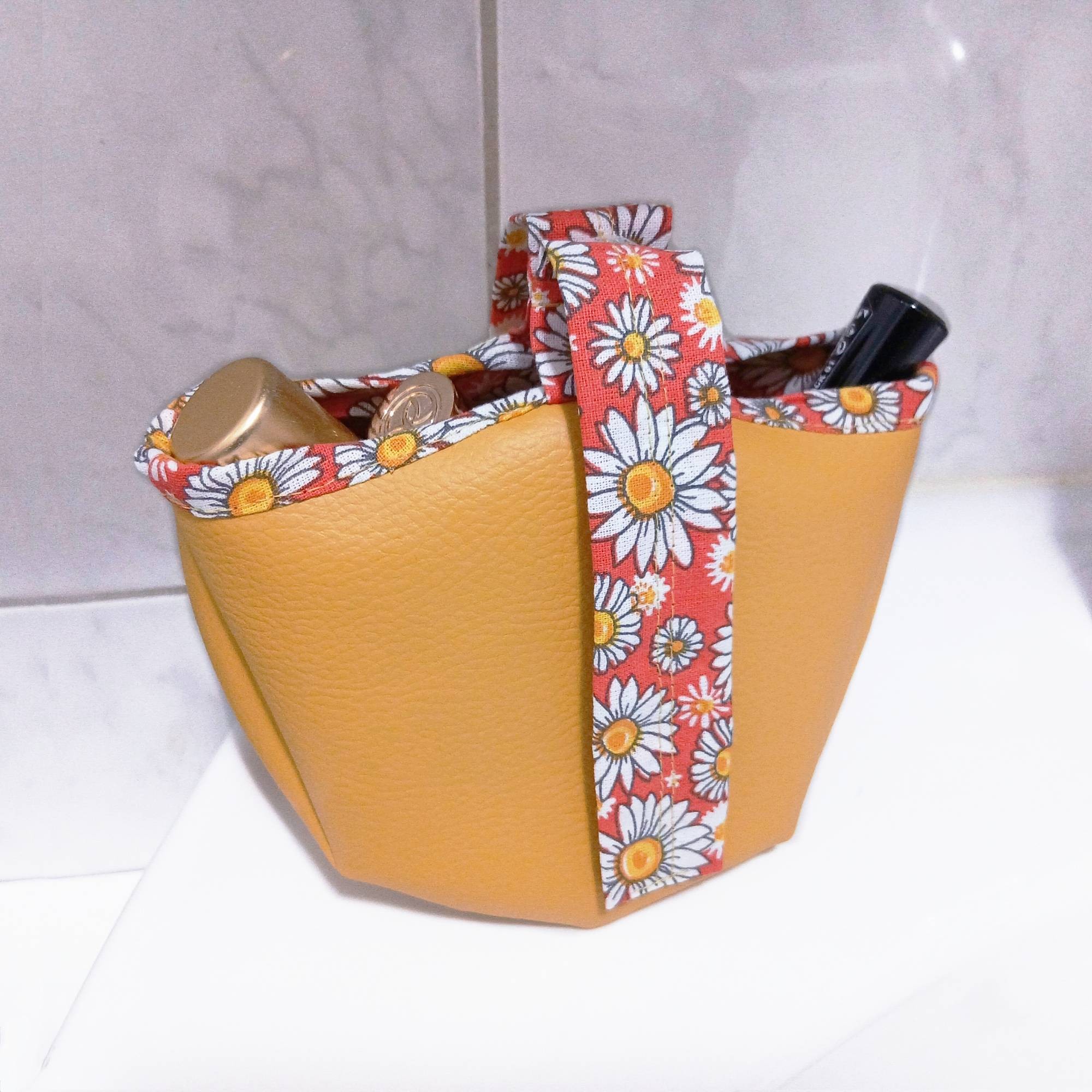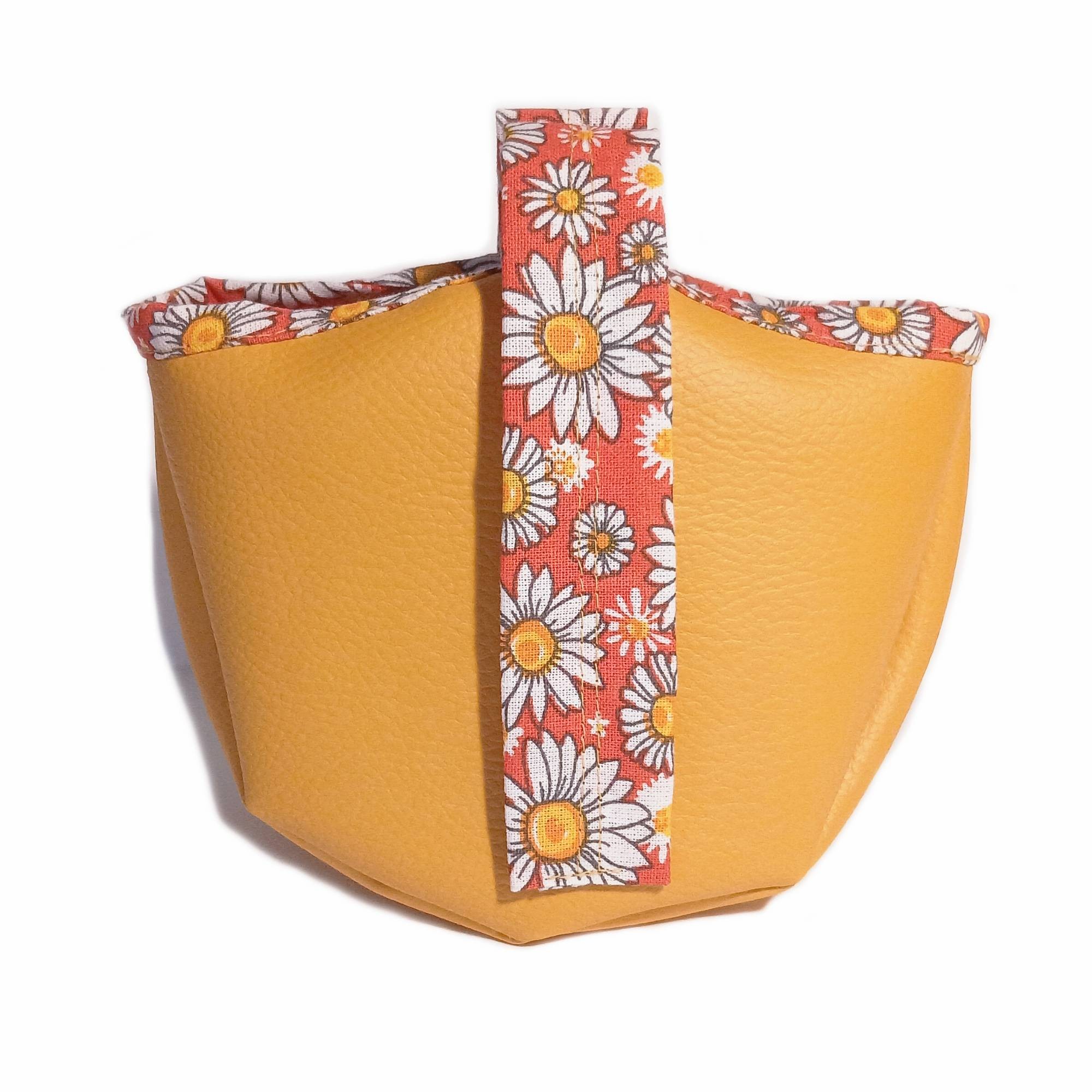De fabrication artisanale, cet article est confectionné dans un simili cuir souple jaune curcuma, d'aspect légèrement grainé. Sa doublure imprimée marguerites de couleur orange et blanc, se prolonge par un ruban qui se ferme grâce à un rond agrippant.