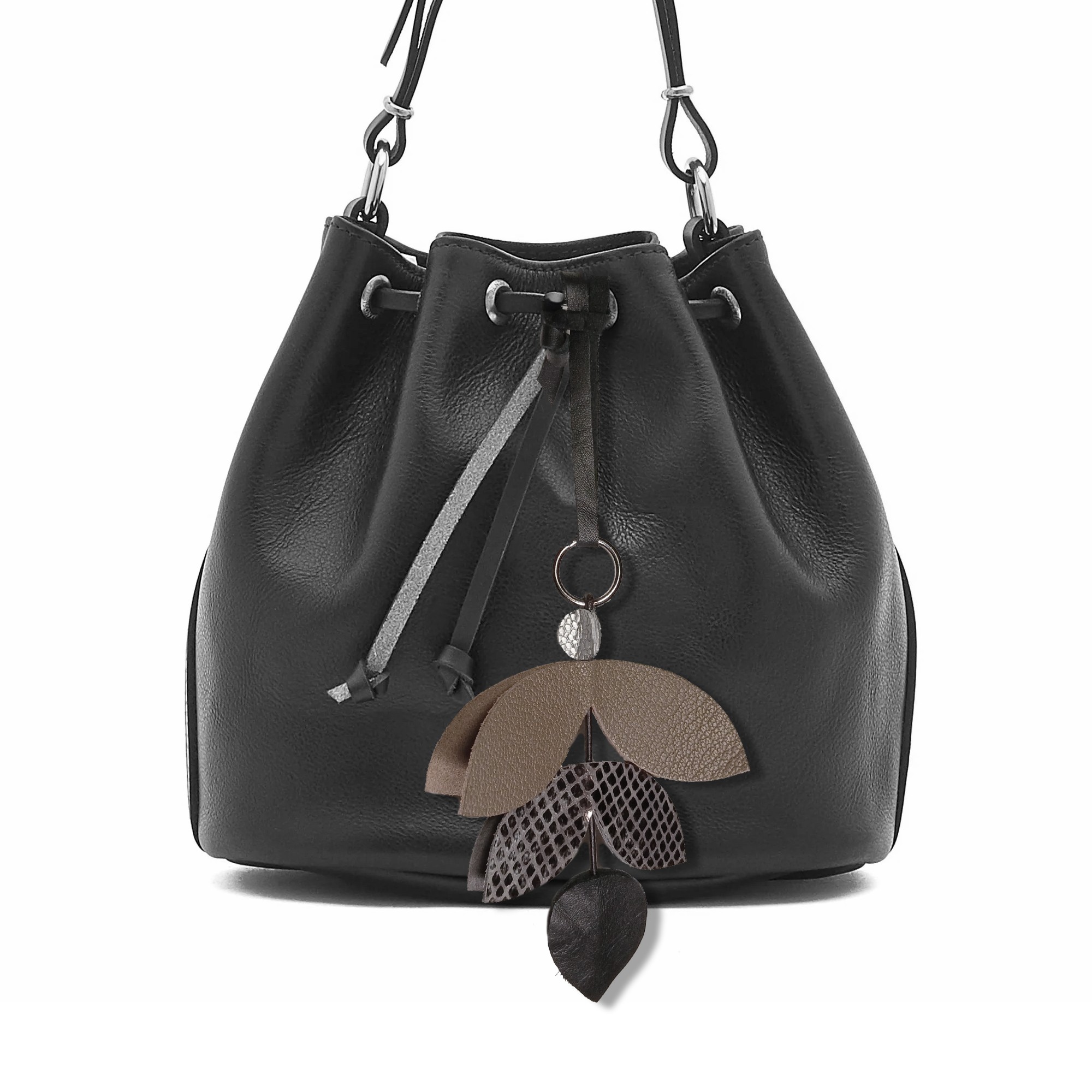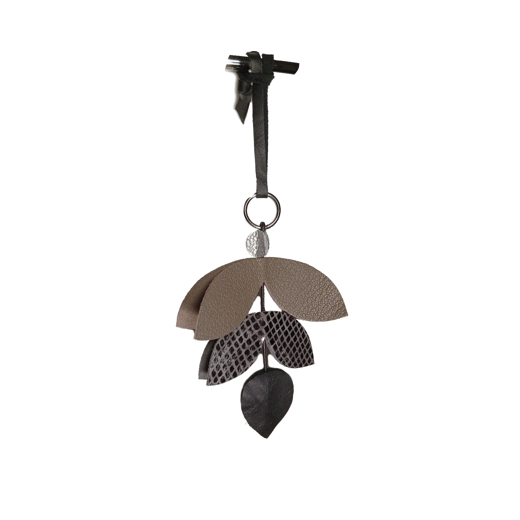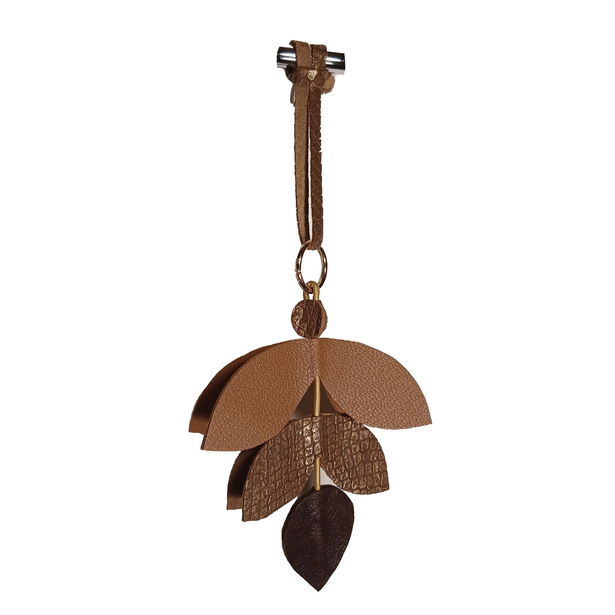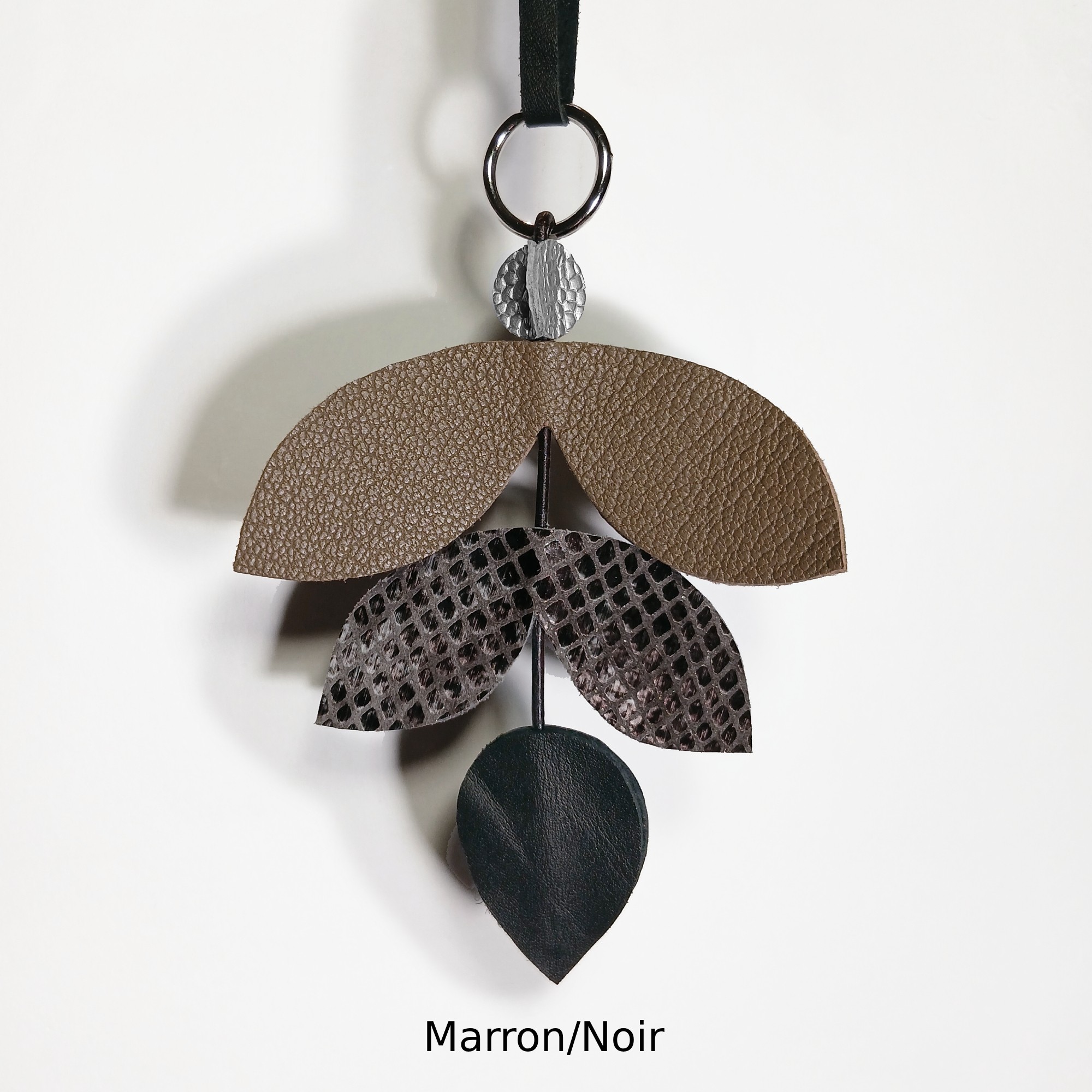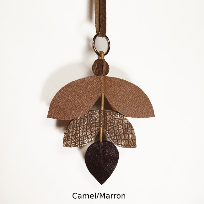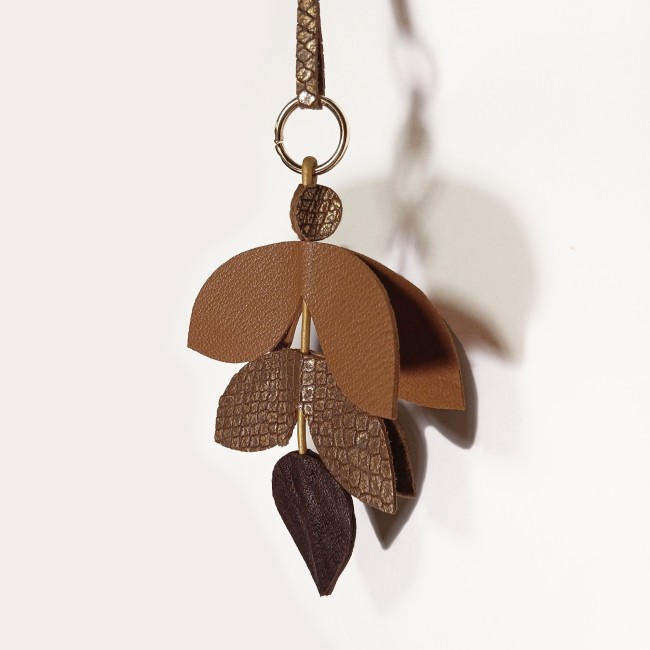 Une jolie forme de feuille stylisée et des déclinaisons de couleurs assorties, font de ce bijou breloque à suspendre un accessoire idéal pour les sacs noirs, marrons foncés, marrons clairs, ou gris.